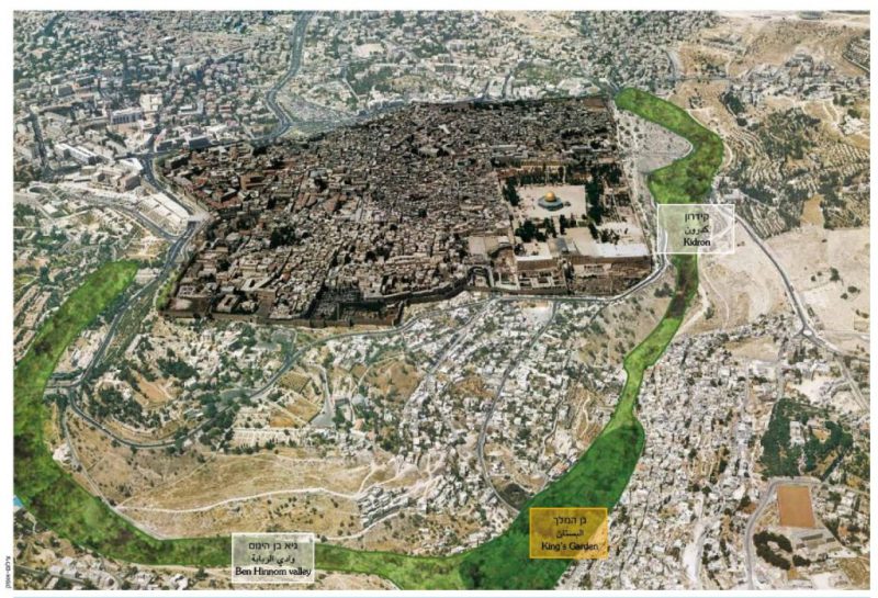 The Kings Garden went from south of where the Kidron meets the Gehenna Valley and up to where the Gihon came out of the City and flowed into the Kidron. If that Garden was still there today it would look much like this next map with the modern city on it.